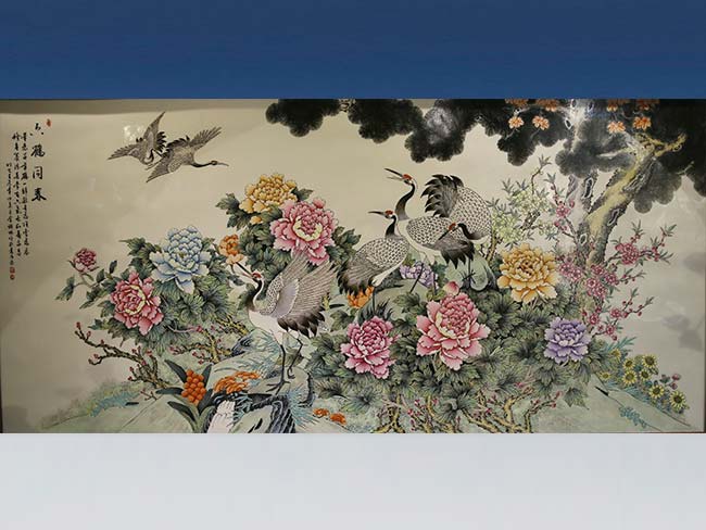 1.75m#0.85m粉彩瓷板《六鹤同春》